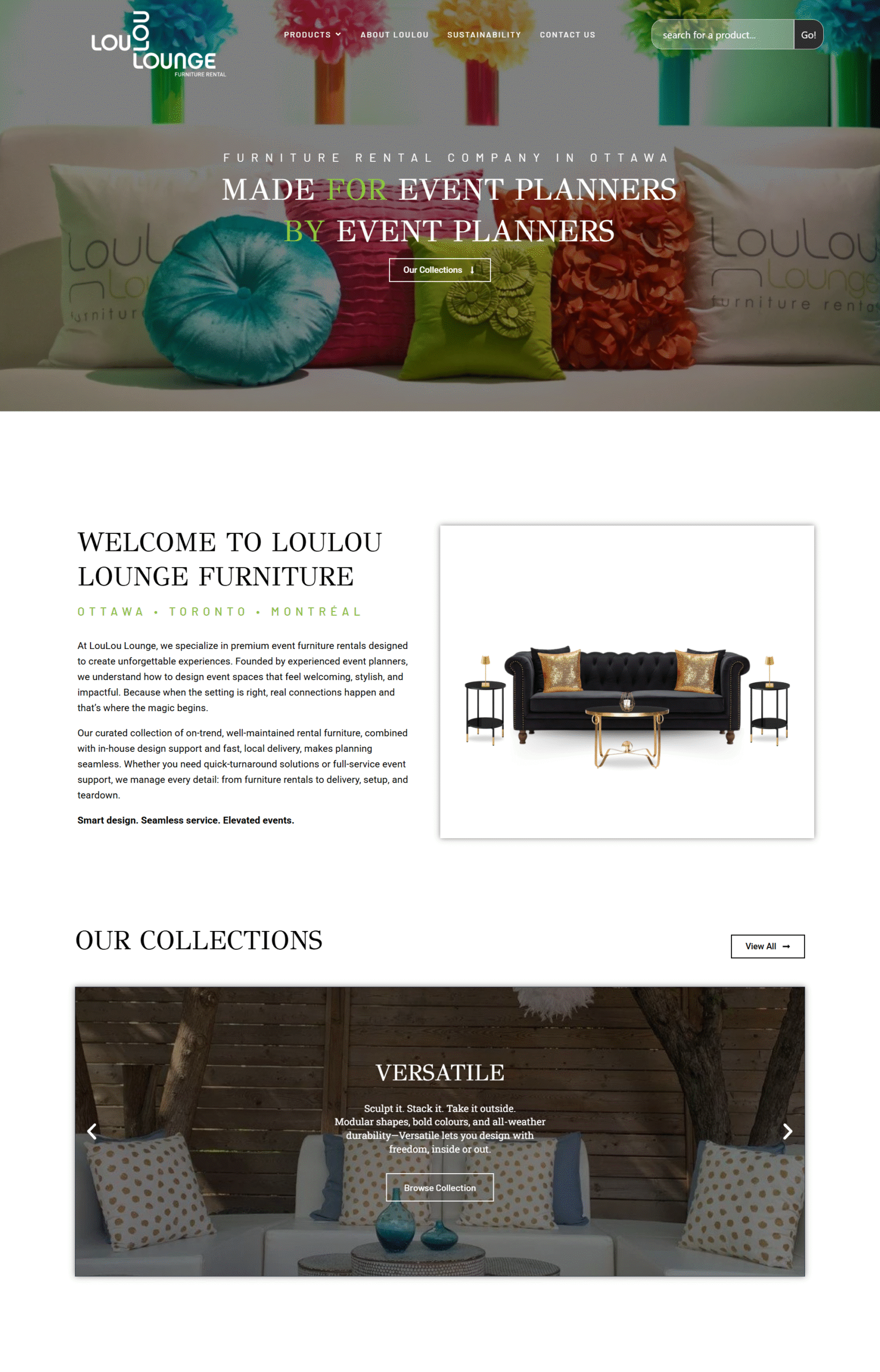 The website features a clean, minimalist aesthetic with a neutral colour palette, allowing LouLou Lounge's high-quality event rentals to take center stage. High-resolution imagery and subtle animations enhance the visual appeal without overwhelming the user.